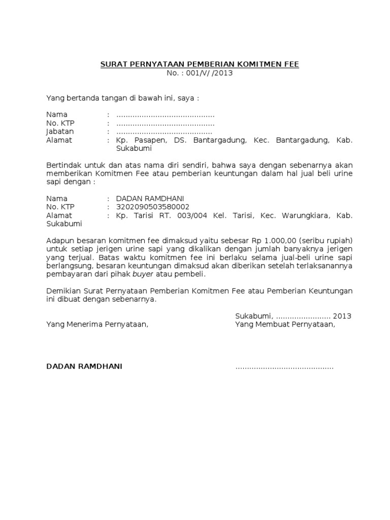 Surat Perjanjian Fee from imgv2-2-f.scribdassets.com Tetapi, dalam beberapa kasus, ada juga surat perjanjian sewa yang. Laporan posisi keuangan laporan komitmen dan ?· g. Pihak i berjanji dan menyatakan akan meberikan fee kepada pihak ii dengan ketentuan sebagai berikut. Direktur pt abc alamat : Contoh surat perjanjian sewa mobil yang baik dan benar. Semoga dapat memudahkan proses dalam mengakuisisi rumah impian. Yang bertanda tangan di bawah ini. Di dalam surat perjanjian jual beli disebutkan bahwasannya penjual wajib memberikan barang kepada pembeli.